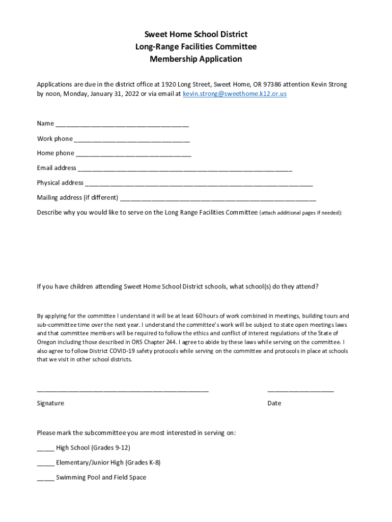 Sweet Home School District Lagrange Facilities Committee Membership Application Applications are due in the district office at 1920 Long Street, Sweet Home, OR 97386 attention Kevin Strong by noon,