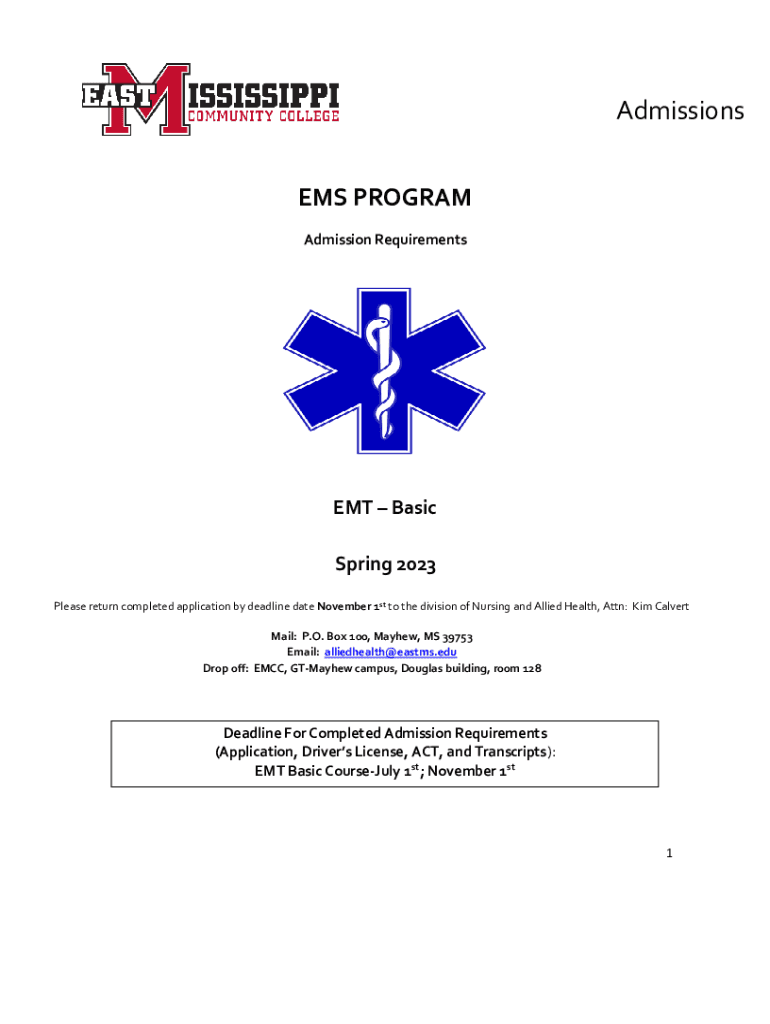 Admissions EMS PROGRAM Admission Requirements EMT Basic Spring 2023 Please return completed application by deadline date November 1st to the division of Nursing and Allied Health, Attn: Kim Calvert