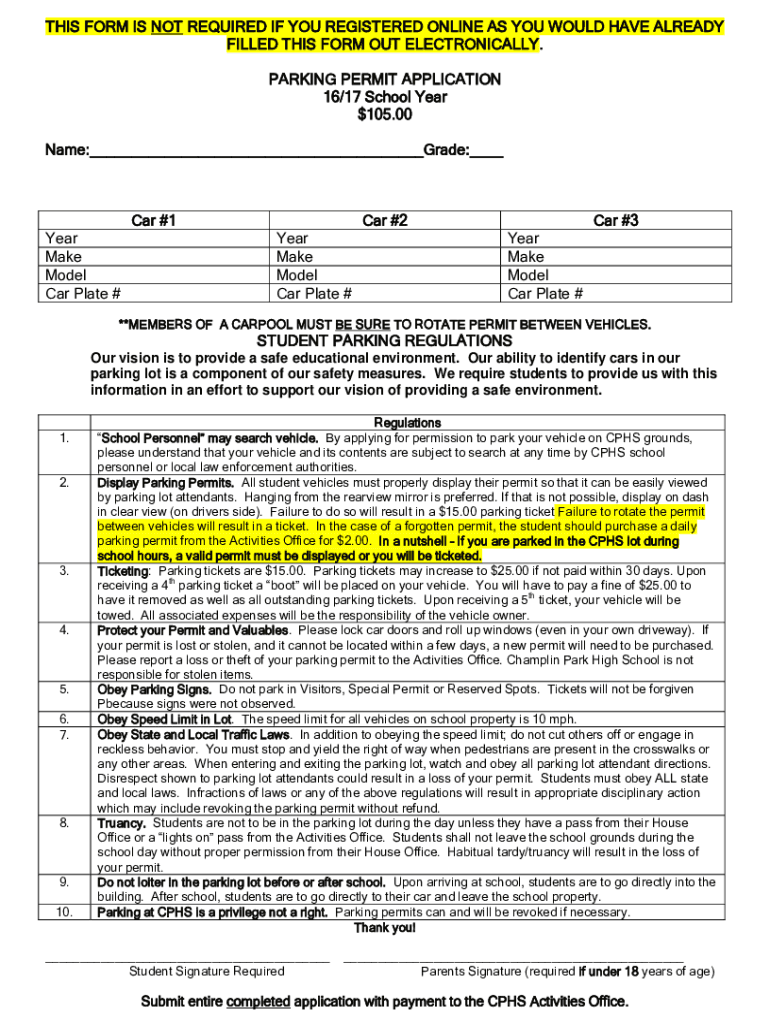 THIS FORM IS NOT REQUIRED IF YOU REGISTERED ONLINE AS YOU WOULD HAVE ALREADY FILLED THIS FORM OUT ELECTRONICALLY. PARKING PERMIT APPLICATION 16/17 School Year $105.00 Name:___Grade:___Car #1 Year