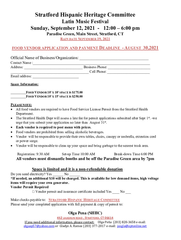Stratford Hispanic Heritage Committee Latin Music Festival Sunday, September 12, 2021 12:00 6:00 pm Paradise Green, Main Street, Stratford, CT RAIN DATE SEPTEMBER 19, 2021FOOD VENDOR APPLICATION AND