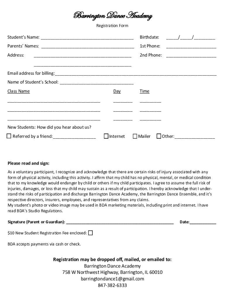 Barrington Dance Academy Registration FormStudents Name: ___Birthdate:___/___/___Parents Names: ___1st Phone:___Address:2nd Phone: ______ ___Email address for billing:___ Name of Students School: