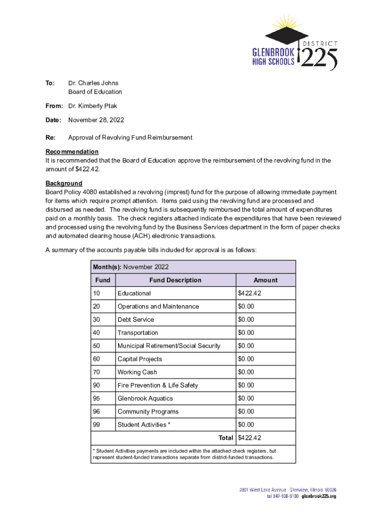 To:Dr. Charles Johns Board of EducationFrom: Dr. Kimberly Peak Date:November 28, 2022Re:Approval of Revolving Fund ReimbursementRecommendation It is recommended that the Board of Education approve