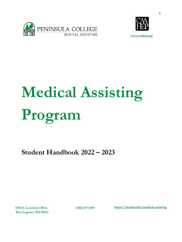 1www.cache.premedical Assisting Program Student Handbook 2022 20231502 E. Lauren Blvd. Port Angeles, WA 98362(360) 4176414https://pencol.edu/medicalassisting2Table of ContentsLast Revised: 03/14/2022Introduction