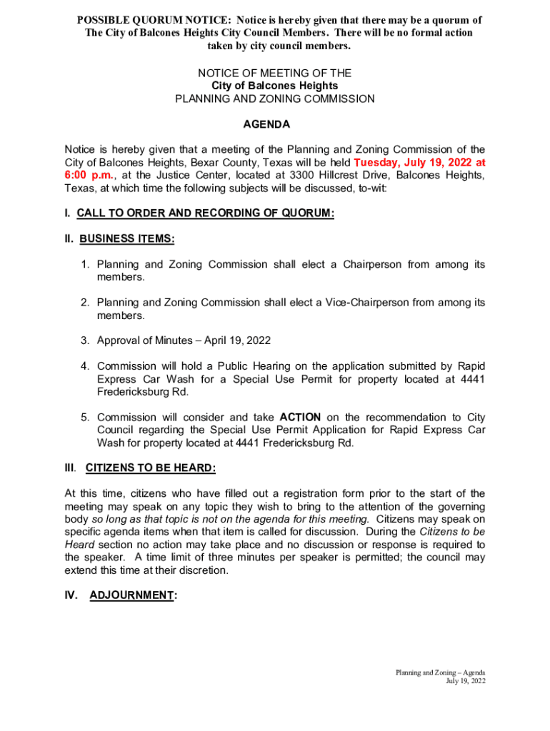 POSSIBLE QUORUM NOTICE: Notice is hereby given that there may be a quorum of The City of Balconies Heights City Council Members. There will be no formal action taken by city council members. NOTICE