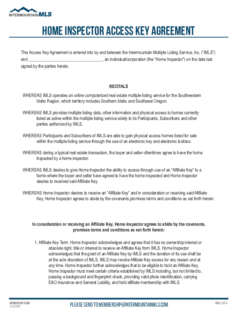 Home Inspector Access Key Agreement This Access Key Agreement is entered into by and between the Intermountain Multiple Listing Service, Inc. (ILLS) and ___, an individual/corporation (the Home Inspector)