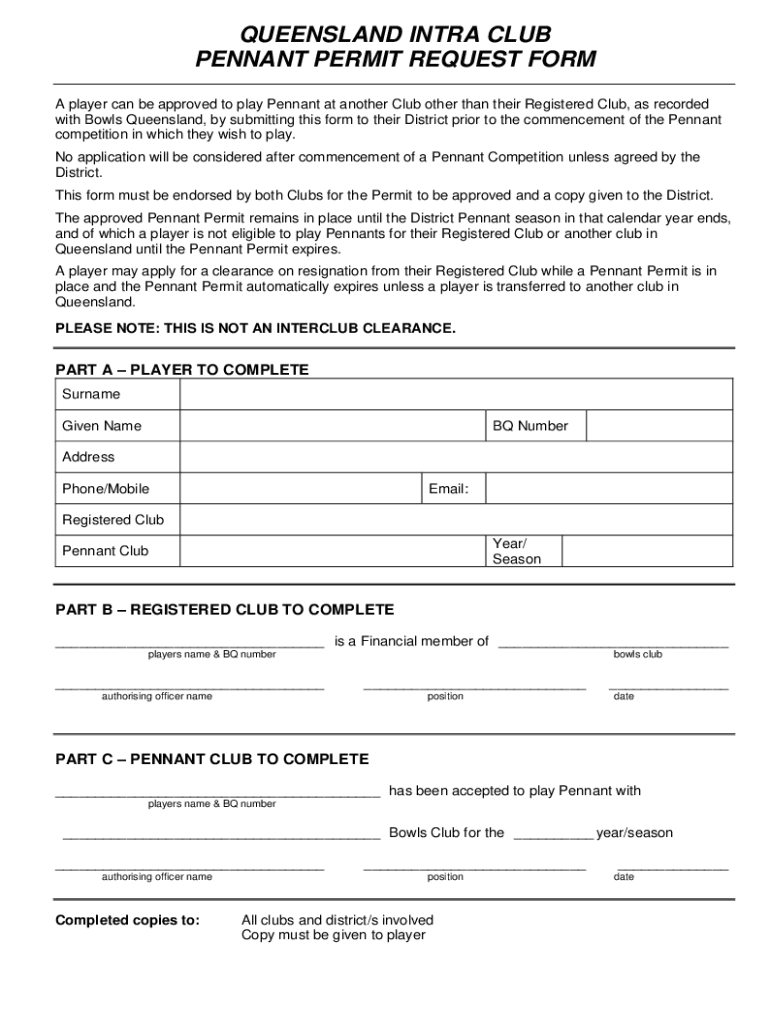 QUEENSLAND INTRO CLUB PENNANT PERMIT REQUEST From A player can be approved to play Pennant at another Club other than their Registered Club, as recorded with Bowls Queensland, by submitting this form