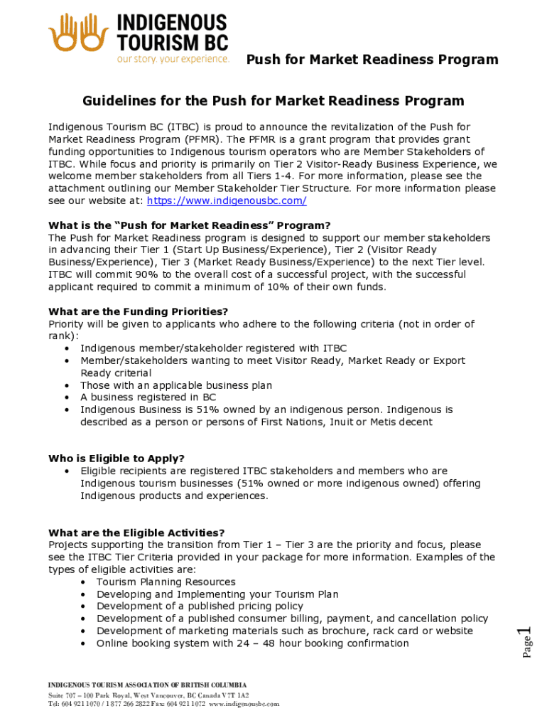 Push for Market Readiness Program Guidelines for the Push for Market Readiness Program Indigenous Tourism BC (ITC) is proud to announce the revitalization of the Push for Market Readiness Program