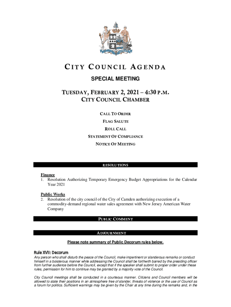 CITY COUNCIL AGENDA SPECIAL MEETINGTUESDAY, FEBRUARY 2, 2021 4:30 P.M. CITY COUNCIL CHAMBER CALL TO ORDER FLAG SALUTE ROLL CALL STATEMENT OF COMPLIANCE NOTICE OF MEETINGRESOLUTIONSFinance 1. Resolution