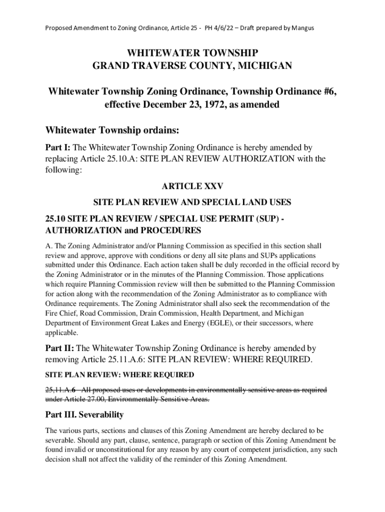 Proposed Amendment to Zoning Ordinance, Article 25 PH 4/6/22 Draft prepared by MangusWHITEWATER TOWNSHIP GRAND TRAVERSE COUNTY, MICHIGAN Whitewater Township Zoning Ordinance, Township Ordinance #6,
