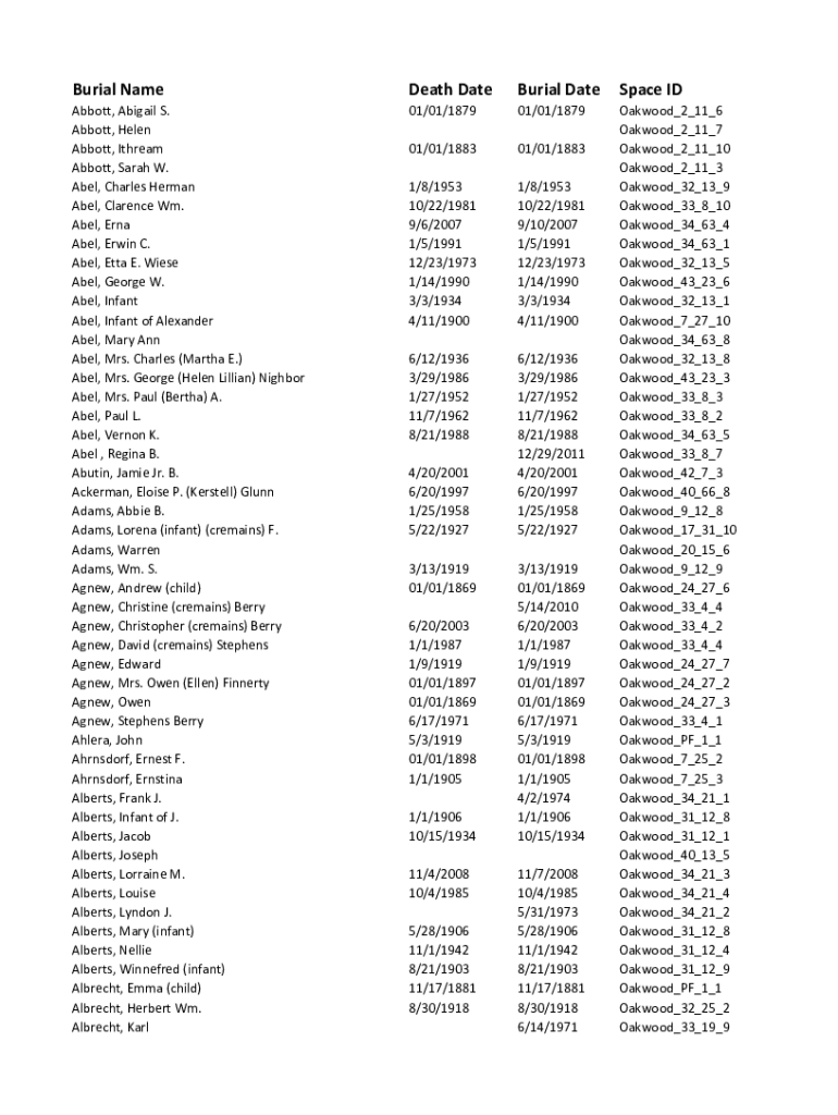 Get the free Burial Name Death Date Burial Date Space ID
