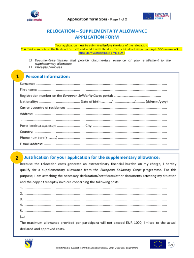 Application form 2bis Page 1 of 2RELOCATION SUPPLEMENTARY ALLOWANCE APPLICATION From Your application must be submitted before the date of the relocation. You must complete all the fields of the form