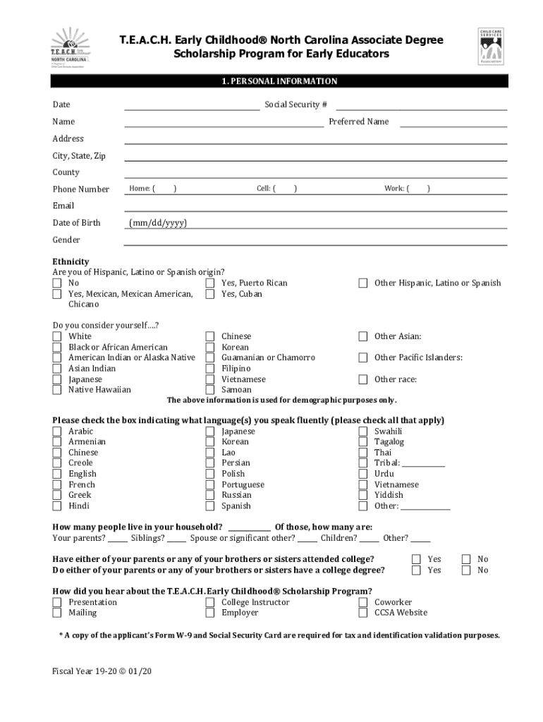 T.E.A.C.H. Early Childhood North Carolina Associate Degree Scholarship Program for Early Educators1. PERSONAL INFORMATIONDateSocial Security #NameAddressCity, State, ZipCountyPhone Cumbersome: ()Mandate