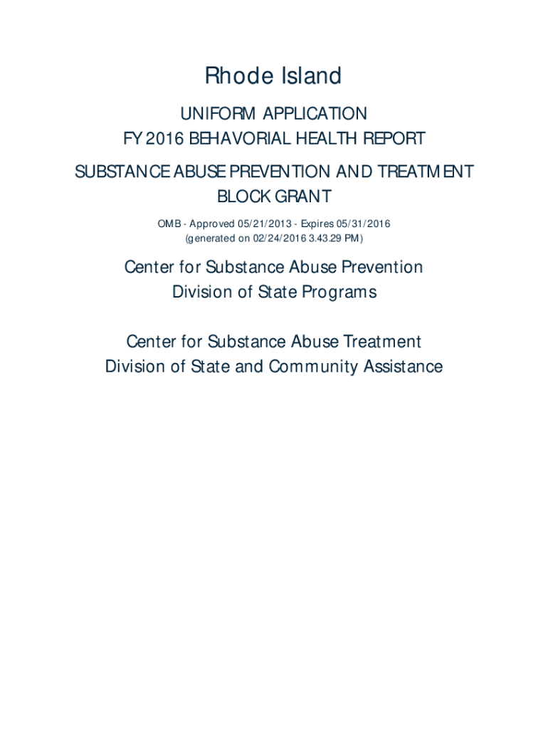 Rhode Island UNIFORM APPLICATION FY 2016 BEHAVIORAL HEALTH REPORT SUBSTANCE ABUSE PREVENTION AND TREATMENT BLOCK GRANT OMB Approved 05/21/2013 Expires 05/31/2016 (generated on 02/24/2016 3.43.29 PM)Center