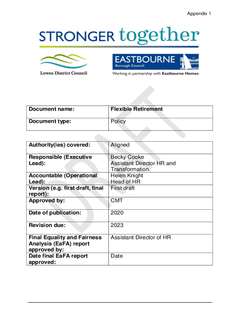 Appendix 1Document name:Flexible RetirementDocument type:PolicyAuthority(IES) covered:AlignedResponsible (Executive Lead):Becky Cooke Assistant Director HR and Transformation. Helen Knight Head of