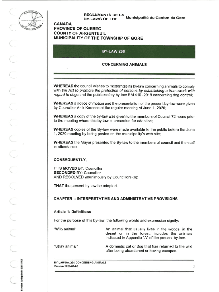 ELEMENTS DE LA Municipality du Canton de Gore BY.LAWS OF THERAVADA PROVINCE OF QUEBEC COUNTY OF ARGENTEUIL MUNICIPALITY OF THE TOWNSHIP OF GORE BY.LAW 238CONCERNING ANIMALSWHEREAS the council wishes