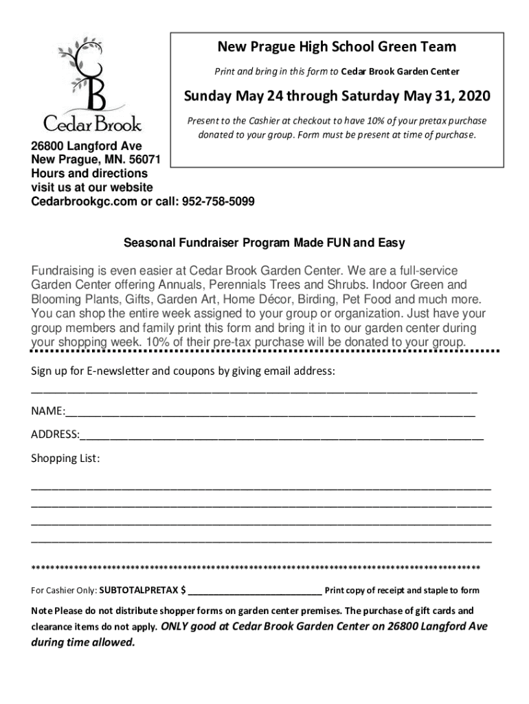New Prague High School Green Team Print and bring in this form to Cedar Brook Garden Center Sunday, May 24 through Saturday, May 31, 2020, Present to the Cashier at checkout to have 10% of your pretax