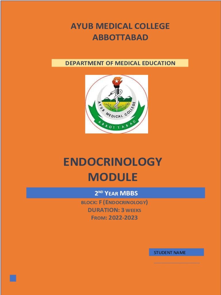 AFUB MEDICAL COLLEGE ABBOTTABAD DEPARTMENT OF MEDICAL EDUCATIONENDOCRINOLOGY MODULE 2ND YEAR MBBS BLOCK: F (ENDOCRINOLOGY)DURATION: 3 WEEKS FROM: 20222023STUDENT NAME ___disclaimer Developing a study