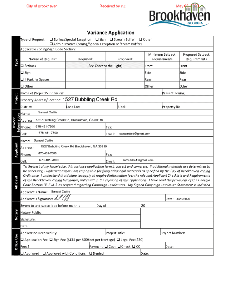 City of BrookhavenReceived by May 06, 2020Variance ApplicationProjectTypeType of Request:Zoning/Special Exception
