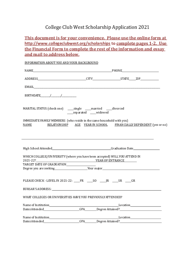 College Club West Scholarship Application 2021This document is for your convenience. Please use the online form HTTP://www.collegeclubwest.org/scholarships to complete pages 12. Use the Financial