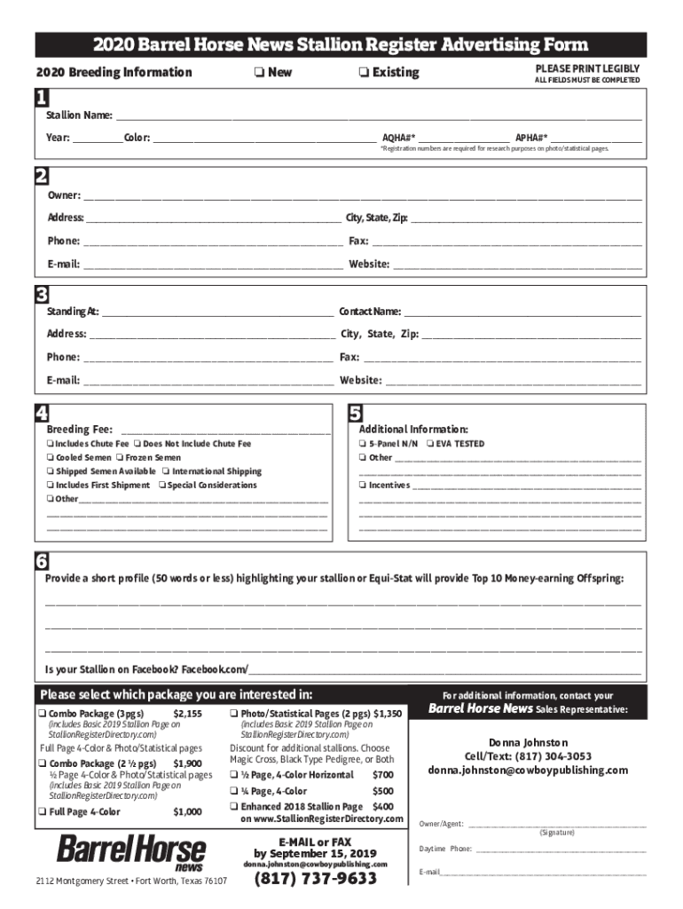 2020 Barrel Horse News Stallion Register Advertising Form 2020 Breeding Information New1PLEASE PRINT LEGIBLY Existing ALL FIELDS MUST BE COMPLETEDStallionName:___ Year:___Color:___ AQUA#*___ ALPHA#*___
