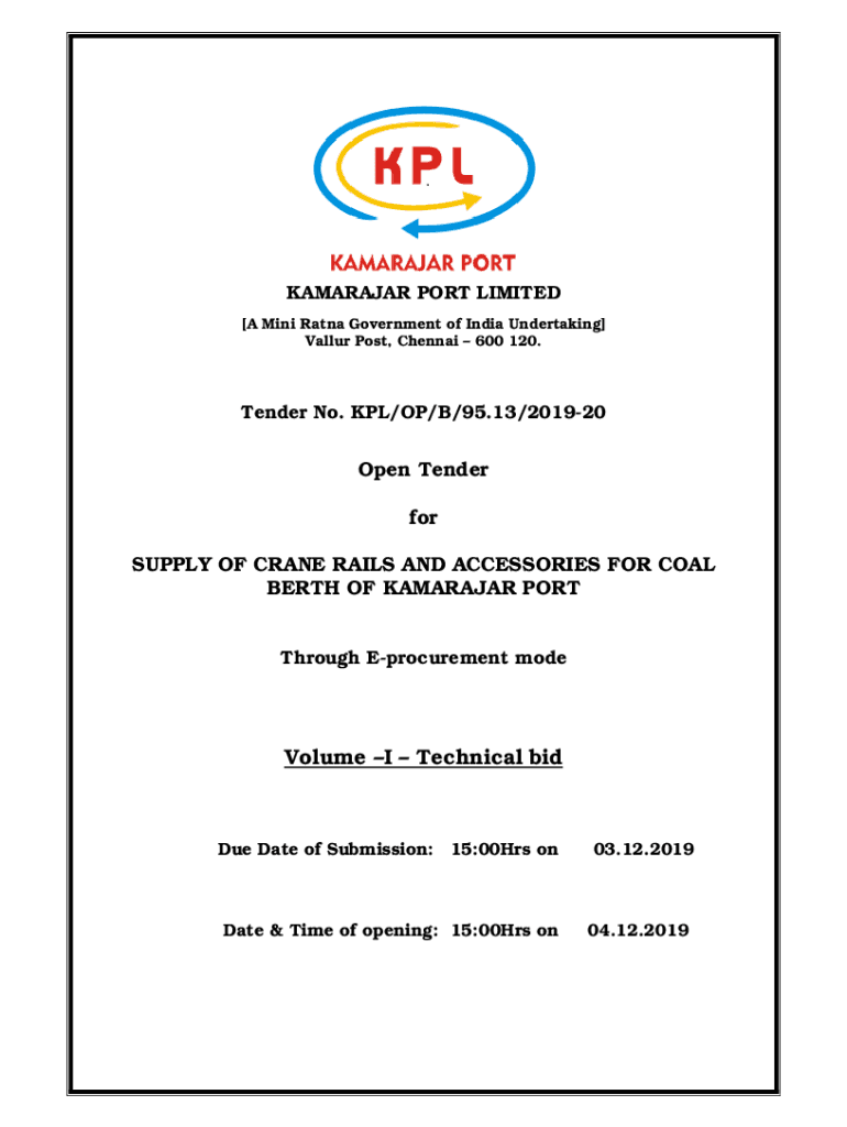 MAHARAJAH PORT LIMITED [A Mini Patna Government of India Undertaking] Value Post, Chennai 600 120. Tender No. KPL/OP/B/95.13/201920Open Tender for SUPPLY OF CRANE RAILS AND ACCESSORIES FOR COAL BERTH