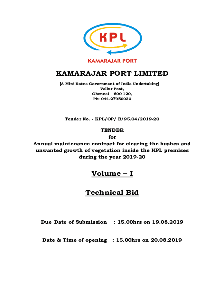 MAHARAJAH PORT LIMITED [A Mini Patna Government of India Undertaking] Value Post, Chennai 600 120, pH: 04427950030Tender No. KPL/OP/ B/95.04/201920TENDER for Annual maintenance contract for clearing
