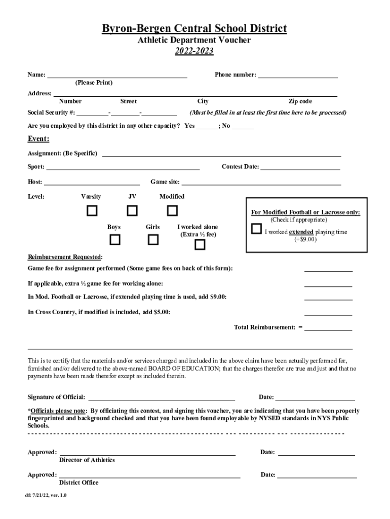 Byron Bergen Central School District Athletic Department Voucher 20222023Name: ___ (Please Print)Phone number: ___Address: ___ Number Street City Zip code Social Security #: _________(Must be filled
