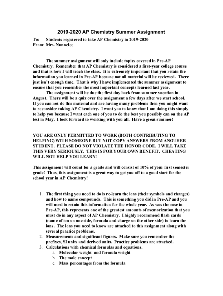 20192020 AP Chemistry Summer Assignment To: Students registered to take AP Chemistry in 20192020 From: Mrs. Funneled The summer assignment will only include topics covered in Prep Chemistry. Remember