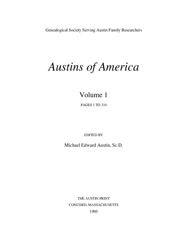 Genealogical Society Serving Austin Family Researchers Austins of America Volume 1 PAGES 1 TO 310EDITED BY Michael Edward Austin, Sc. D.THE AUSTIN PRINT CONCORD, MASSACHUSETTS1995First Edition October