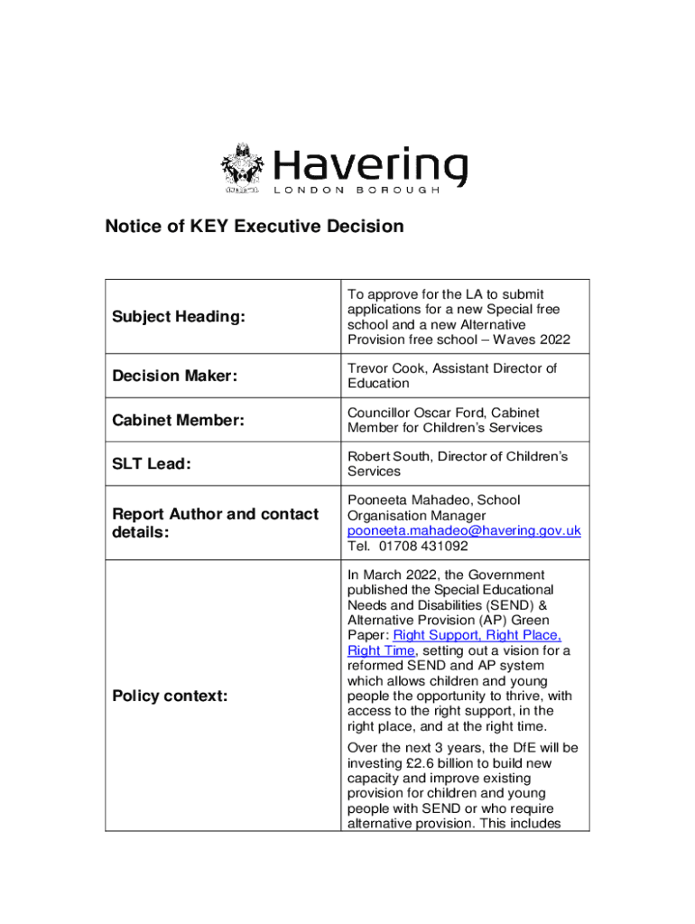 Notice of KEY Executive DecisionSubject Heading:To approve for the LA to submit