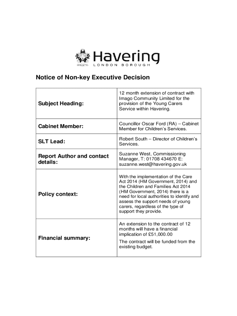 Notice of Monkey Executive DecisionSubject Heading:12 month extension of contract with Imago Community Limited for the provision of the Young Carers Service within Hovering. Cabinet Member:Councillor