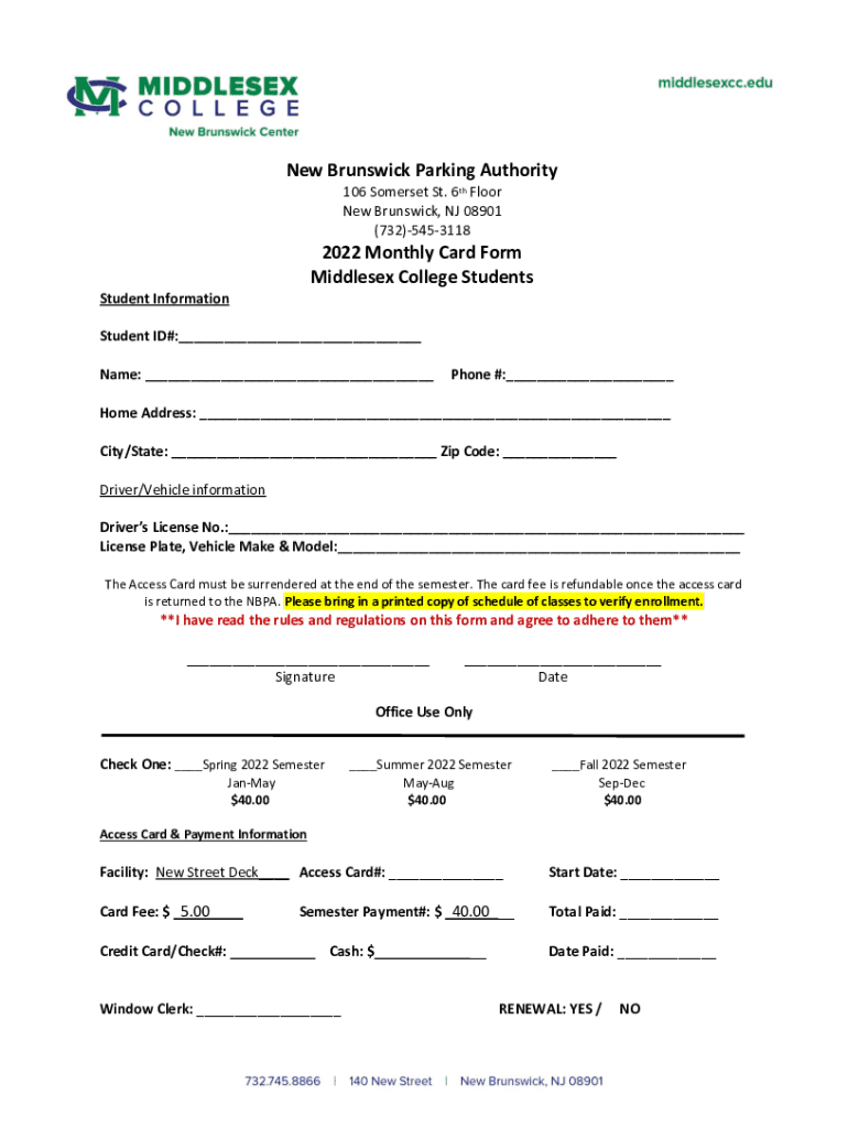 New Brunswick Parking Authority 106 Somerset St. 6th Floor New Brunswick, NJ 08901 (732)54531182022 Monthly Card Form Middlesex College Students Student Information Student ID#:___ Name: ___Phone