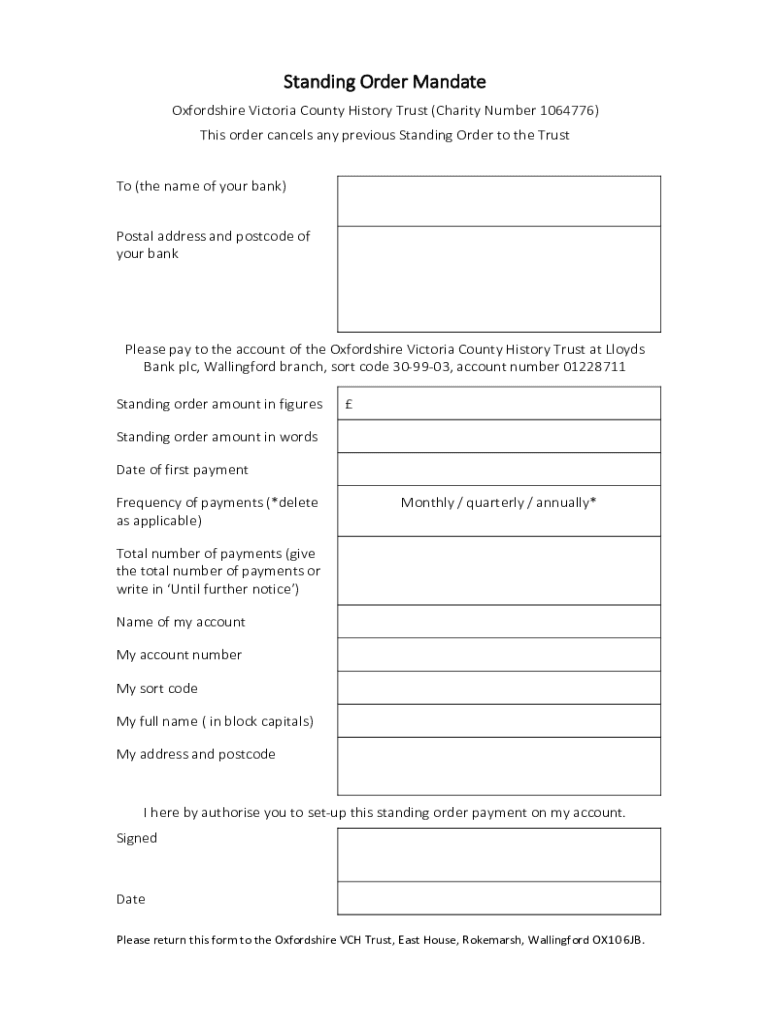 Standing Order Mandate Oxfordshire Victoria County History Trust (Charity Number 1064776) This order cancels any previous Standing Order to the Trust To (the name of your bank) Postal address and