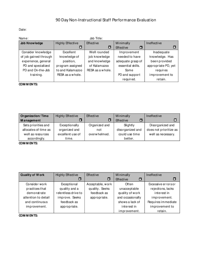 90 Day Instructional Staff Performance Evaluation Date: Name: Job Knowledge Job Title: EffectiveHighly Effective Consider knowledge of job gained through experience, general PD and specialized PD