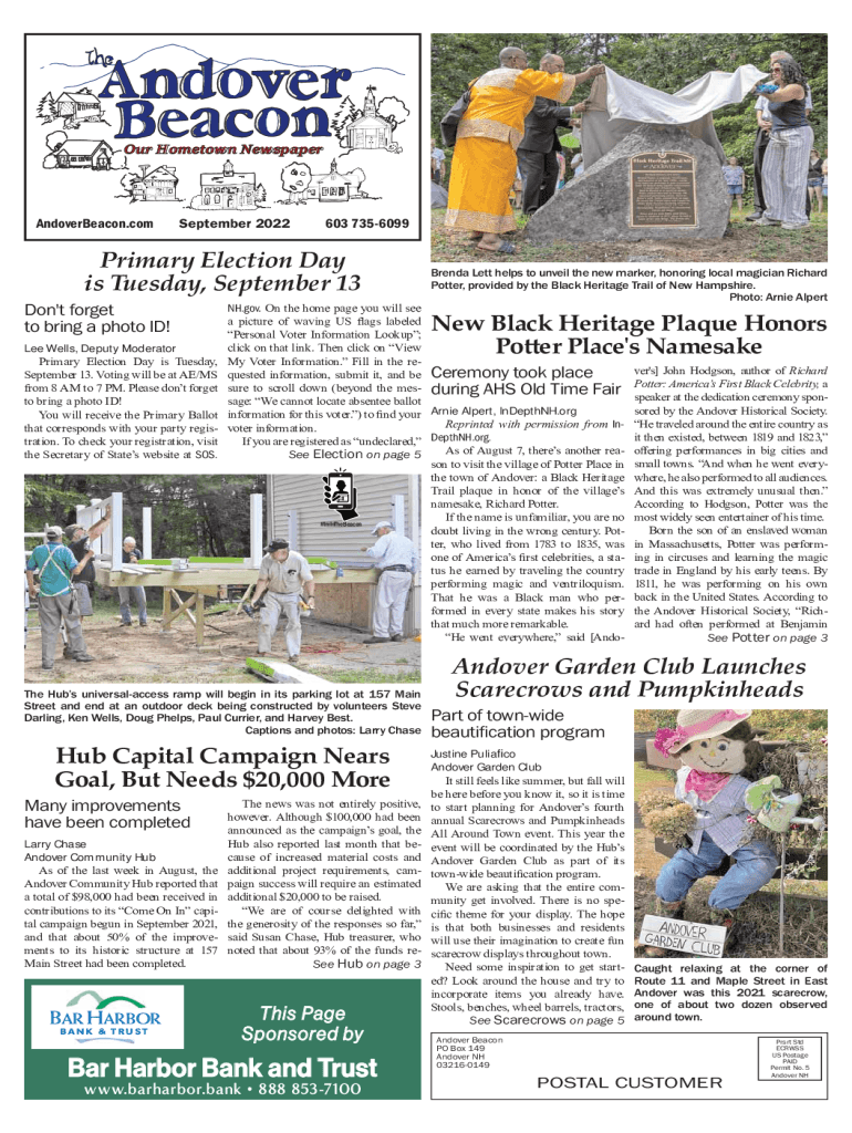 Our Hometown NewspaperAndoverBeacon.com September 2022603 7356099Primary Election Day is Tuesday, September 13 Don\'t forget to bring a photo ID! Lee Wells, Deputy Moderator Primary Election Day is