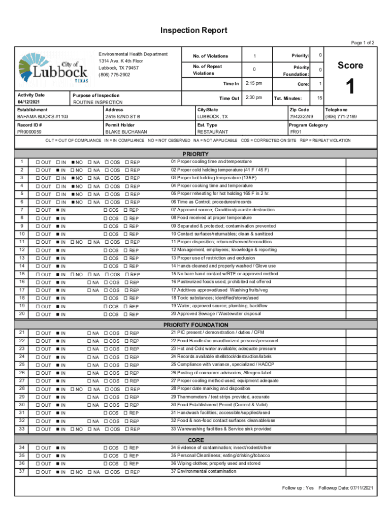 (806) 7752902Activity Repurpose of Inspection04/12/2021ROUTINE INSPECTIONPriority:1No. Of Violations