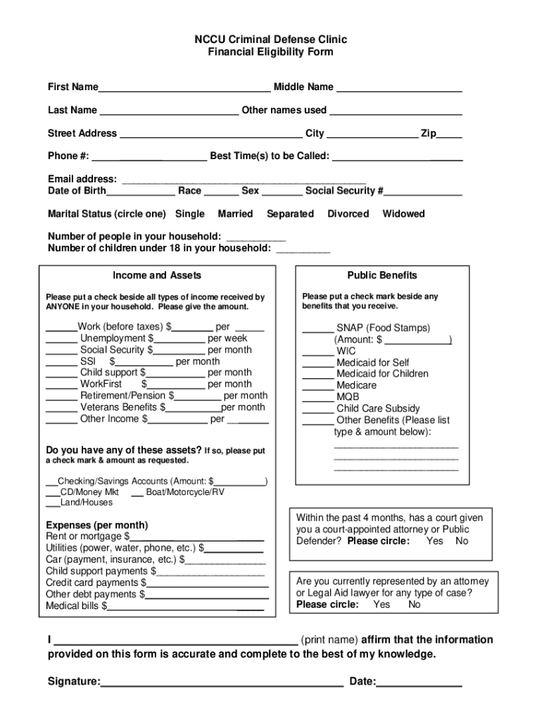 Get the free NCCU Criminal Defense Clinic Financial Eligibility Form - law nccu