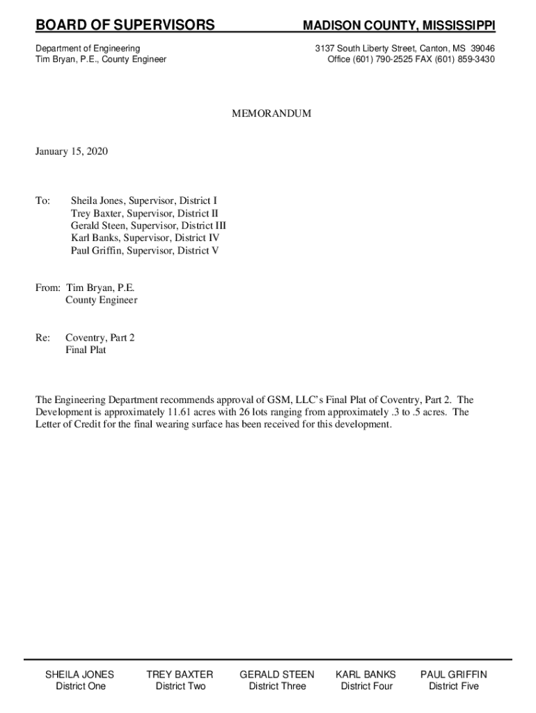 BOARD OF SUPERVISORS__MADISON COUNTY, MISSISSIPPIDepartment of Engineering Tim Bryan, P.E., County Engineer3137 South Liberty Street, Canton, MS 39046 Office (601) 7902525 FAX (601) 8593430MEMORANDUMJanuary