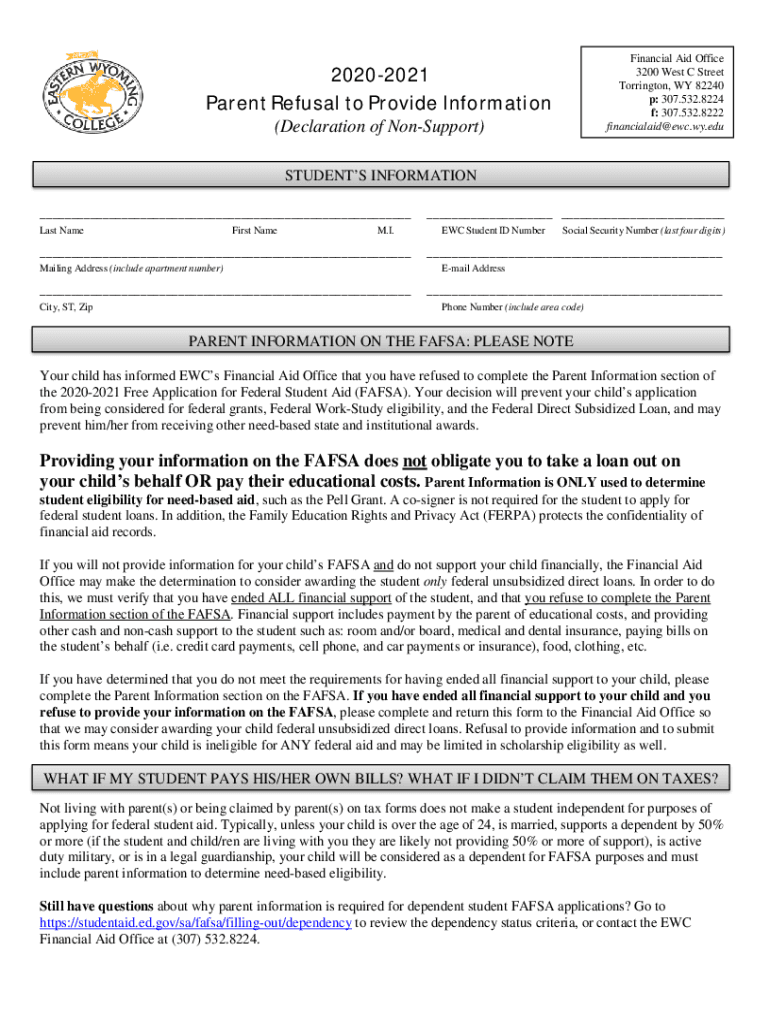 Financial Aid Office 3200 West C Street Torrington, WY 82240 p: 307.532.8224 f: 307.532.8222 financialaid@ewc.wy.edu20202021 Parent Refusal to Provide Information (Declaration of Nonsupport) STUDENTS