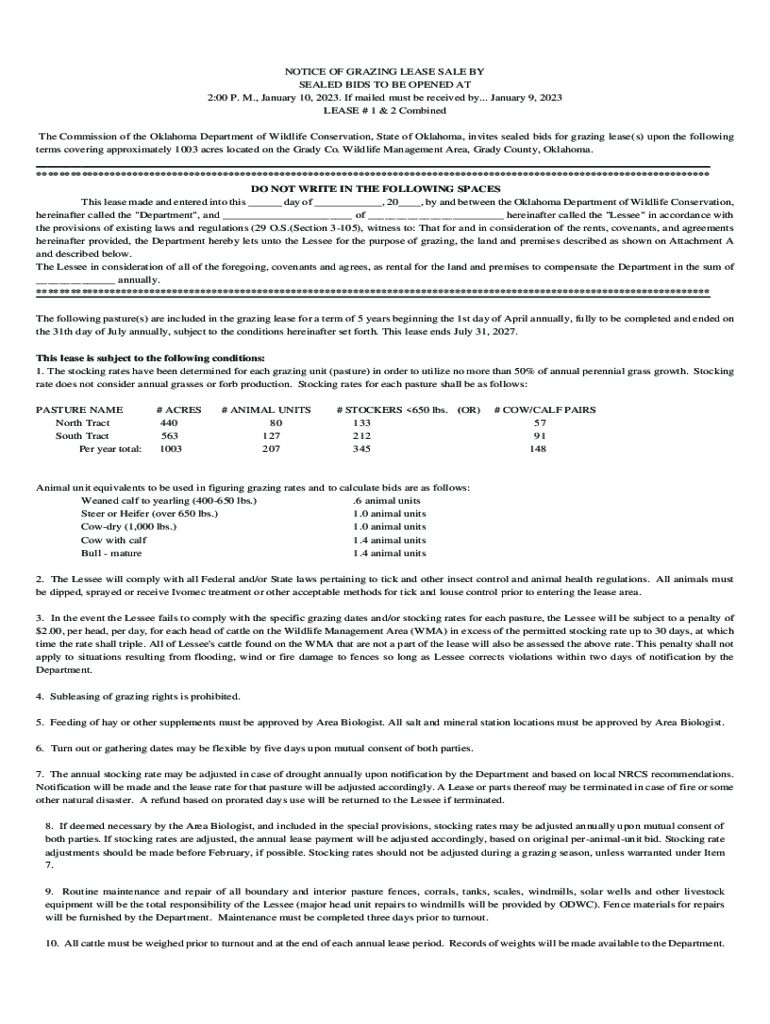 NOTICE OF GRAZING LEASE SALE BY SEALED BIDS TO BE OPENED AT 2:00 P. M., January 10, 2023. If mailed must be received by... January 9, 2023, LEASE # 1 & 2 Combined The Commission of the Oklahoma Department