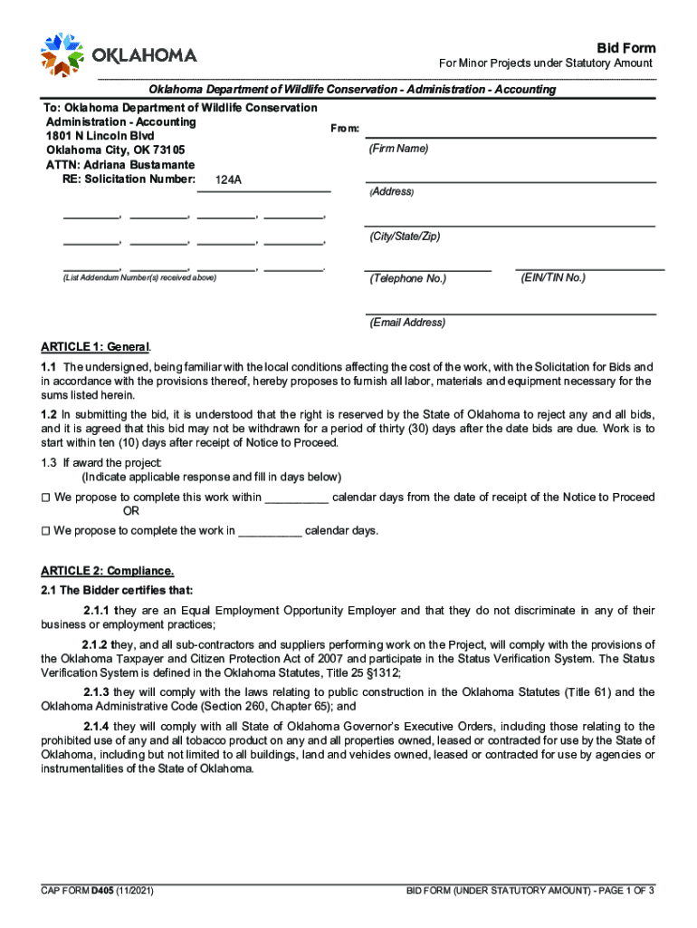 Solicitation Cover Page IRU0LQRU3URMHFWVXQGHU6WDWXWRU$PRXQW 2NODKRPD \'HSDUWPHQWRI:LOGOLIH&RQVHUYDWLRQ $GPLQLVWUDWLRQ$FFRXQWLQJ 6ROLFLWDWLRQ,QIRUPDWLRQ 124A 6ROLFLWDWLRQ1XPEHUBBBBBBBUsing Agency Information:Oklahoma