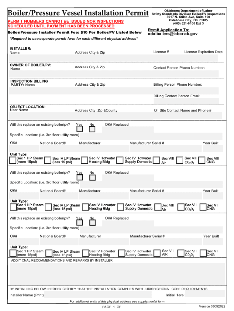 Clear Potboiler/Pressure Vessel Installation Permit NUMBERS CANNOT BE ISSUED NOR INSPECTIONS SCHEDULED UNTIL PAYMENT HAS BEEN PROCESSED Boiler/Pressure Installer Permit Fee: $10 Per Boiler/PV Listed