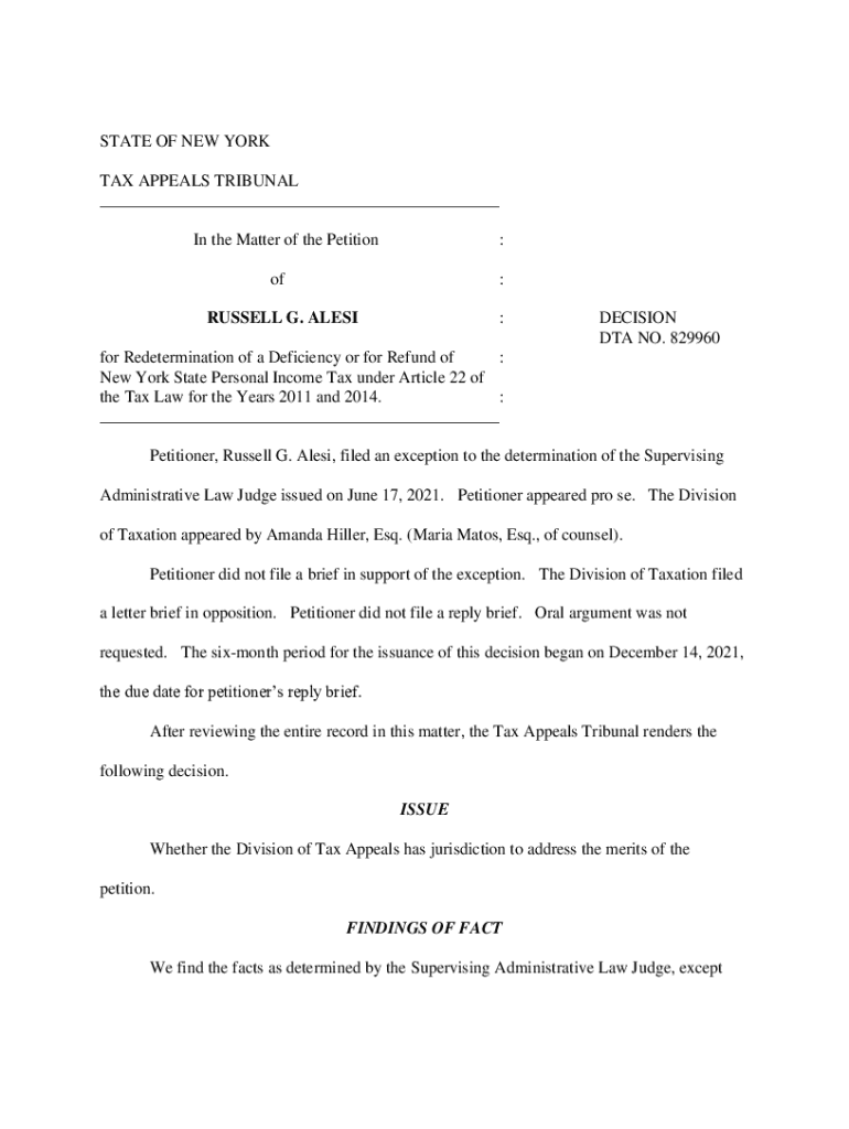 STATE OF NEW YORK TAX APPEALS TRIBUNAL ___ In the Matter of the Petition:of:RUSSELL G. ALES:DECISION DTA NO. 829960for Redetermination of a Deficiency or for Refund of : New York State Personal Income