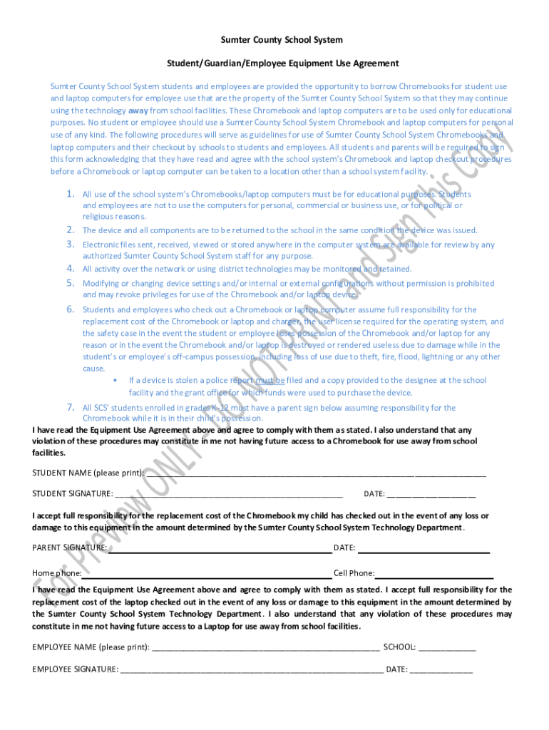 Sumter County School System Student/Guardian/Employee Equipment Use Agreement Sumter County School System students and employees are provided the opportunity to borrow Chromebooks for student use