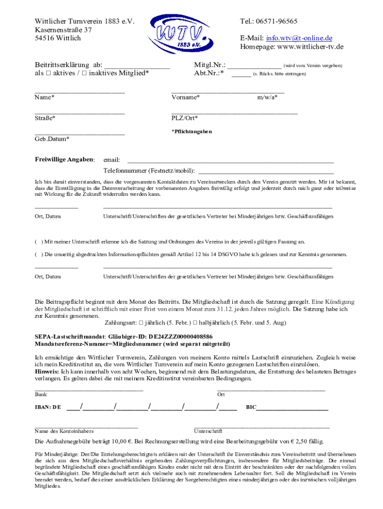 Mitglieder des Vereins oder Personen, die eine Mitgliedschaft beantragen möchten, müssen den Wittlicher Turnverein e.V. ausfüllen und einreichen.