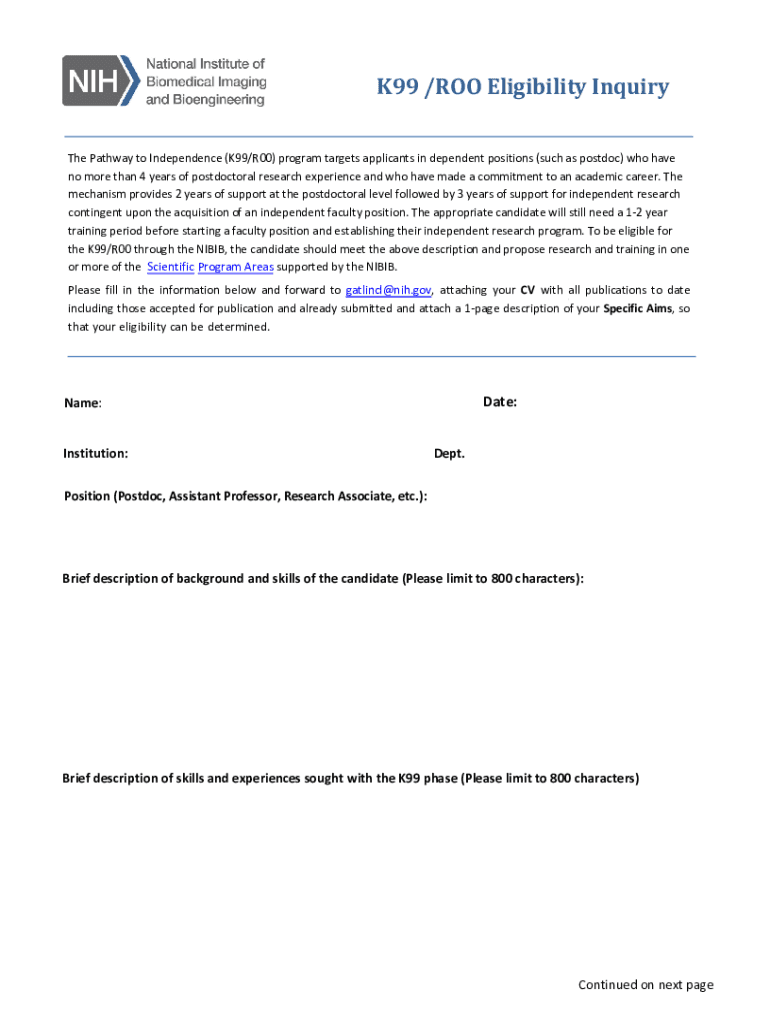 National Institute of Biomedical Imaging and BioengineeringK99 /TOO Eligibility Inquiry Pathway to Independence (K99/R00) program targets applicants in dependent positions (such as postdoc) who have