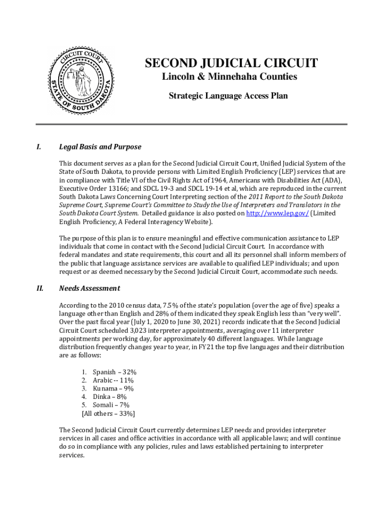 SECOND JUDICIAL CIRCUIT Lincoln & Minnesota Counties Strategic Language Access Plan. Legal Basis and Purpose This document serves as a plan for the Second Judicial Circuit Court, Unified Judicial