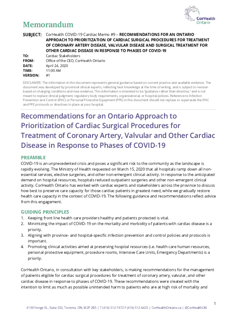 Memorandum SUBJECT: Health COVID-19 Cardiac Memo #9 RECOMMENDATIONS FOR AN ONTARIOAPPROACH TO PRIORITIZATION OF CARDIAC SURGICAL PROCEDURES FOR TREATMENT OF CORONARY ARTERY DISEASE, VALVULAR DISEASE