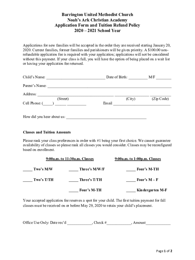 Barrington United Methodist Church Noah's Ark Christian Academy Application Form and Tuition Refund Policy 2020 2021 School Year Applications for new families will be accepted in the order they are