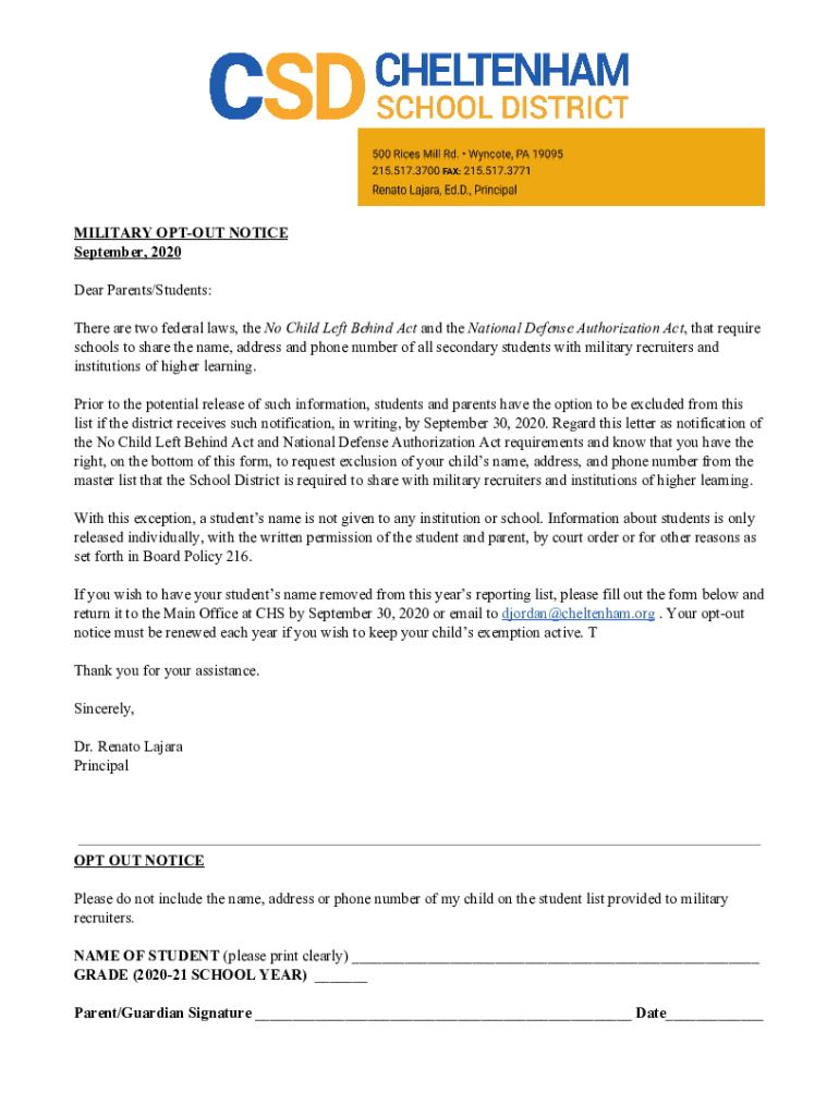 MILITARY OPT-OUT NOTICE September 2020 Dear Parents/Students: There are two federal laws, the No Child Left Behind Act and the National Defense Authorization Act, that require schools to share the